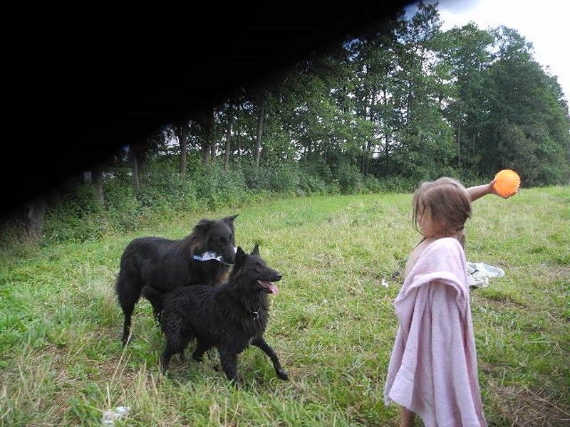 Moi, NOELLE MARIE-THERESE OBCARSKAS et mes chiens FEE NOIRE et FAUCON 30 juillet 2014 en LITUANIE en robe de lin coquelicots et ambre vert, températures ces derniers jours les plus chauds depuis 50 ans 32 celcius à l'ombre et 38 celcius sous soleil direct. Réchauffement climat hein ! meme les abeilles ont besoin d'ombre, car les grosses chaleurs ralentissent le travail et fait du mal au corps ! il faut pas laisser les chiens dans la voiture meme 5 minutes pour éviter dommages aux organes ! et assurer qu'ils ont toujours endroit a l'ombre et de l'eau accessible ! 4 chiens sont officiellement morts de la chaleur au Championnat de France en 2014 je lis dans Revue Chiens. Il ne faut pas etre négligeant envers nos chiens. Ceux qui ne meurent pas souffrent terriblement dans ces circonstances. Je ne vais pas en expo si un de mes chiens doit rester dans la voiture dans températures comme ça non. Le 4 octobre en France il faisait 30 celcius encore à Toulouse !